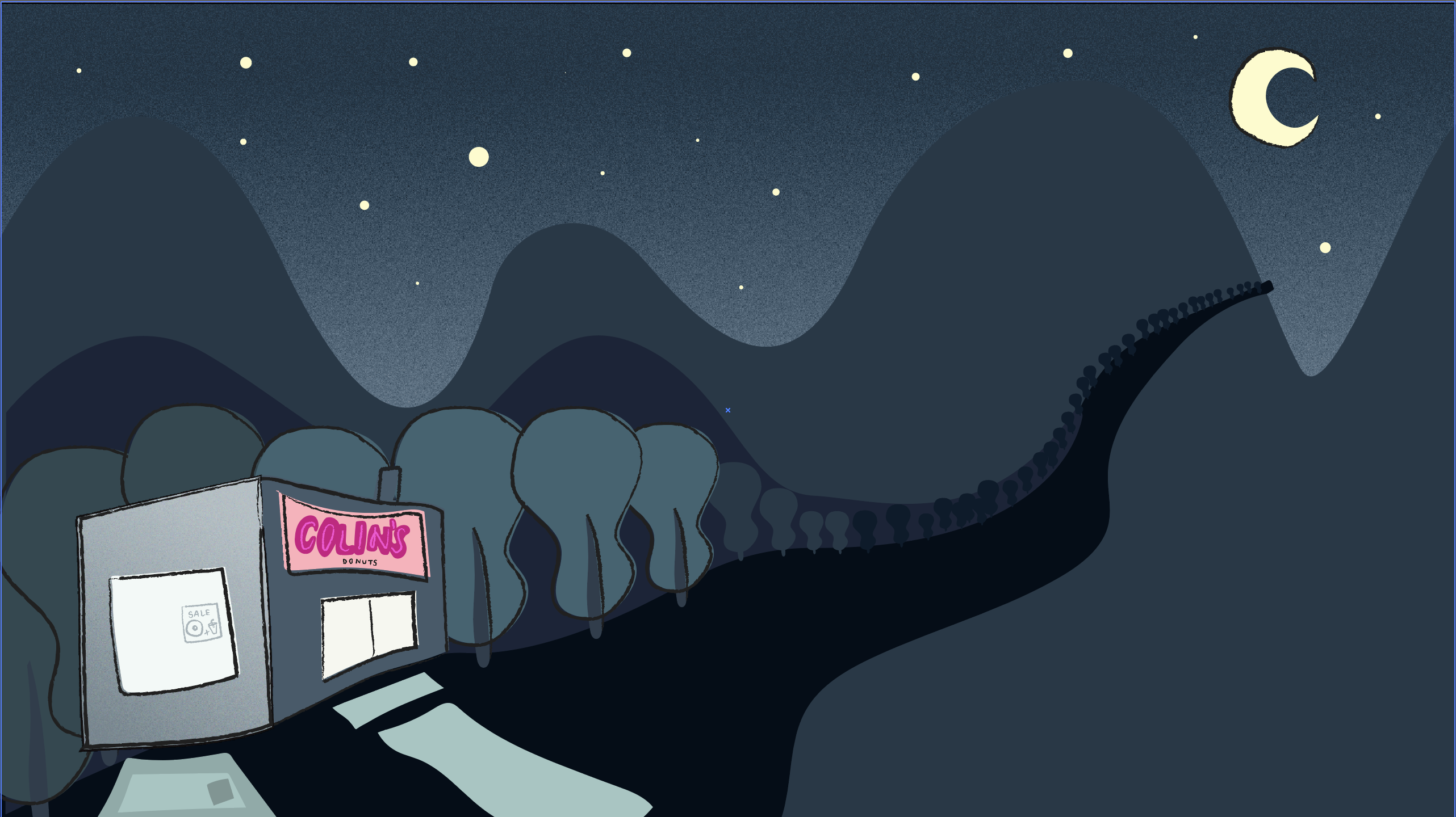 The following shows my progress work, thus far, on the night scene for “Colin’s Donut Shop”.